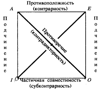 Простые суждения, имеющие одинаковые термины (субъект и предикат) и различающиеся по качеству и по количеству, находятся в определенных отношениях по истинности и ложности, которые иллюстрируются с помощью логической схемы (логического квадрата).