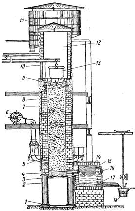Шихту загружают в вагранку через окно 10 бадьей 13. Пространство над горном до загрузочного окна называют шахтой печи. Футеровку верхней части шахты предохраняют от ударов кусками шихты чугунные плиты 9. Продукты горения и частицы раскаленного кокса удаляются через дымовую трубу 12 и искрогаситель 11.