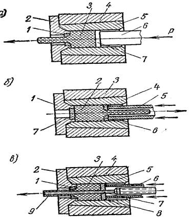 При обратном методе прессования металла (рис. 31, б) во втулку 4 контейнера 3 входит полый пуансон 5 с матрицей 6 на его конце; выходное отверстие в матрицедержателе 1 закрыто заглушкой 7. При движении пуансона матрица давит на слиток 2, в результате чего металл вытекает через отверстие матрицы в направлении, обратном перемещению пуансона.