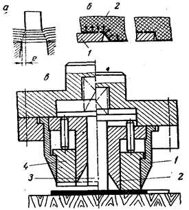 Неметаллические материалы – кожа, бумага, картон и другие – штампуются на упрощенных просечных штампах. Просечный штамп для вырубки шайбы (рис. 58, в)производит одновременно две операции: вырубку наружного контура кольцевым ножом 1 и пробивку внутреннего отверстия пуансоном 2. Вырубленное изделие удаляется выталкивателями 3 и 4. Штамповка производится на подкладке из неметаллического материала.