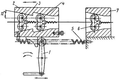 В качестве устройств для подачи ленты применяются валковые, роликовые, клещевые и крючковые механизмы. Из них наиболее универсальными являются валковые, а затем роликовые. Эти механизмы обеспечивают значительный шаг подачи и точность. Крючковые могут использоваться только при наличии Прочной перемычки у отхода.