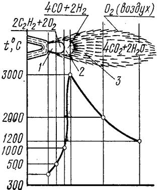 состоит из раскаленных частиц углерода, сгорающих в наружном ее слое. Восстановительная зона располагается за ядром и имеет более темный цвет. Эта зона состоит из продуктов неполного сгорания ацетилена.