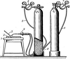 1 – стол; 2 – свариваемые детали; 3 – присадочный металл; 4 – горелка; 5 – рукав; 6 – ацетиленовый редуктор; 7 – кислородный редуктор; 8 – пористая масса