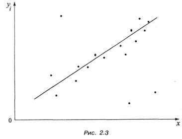 2. Ошибки выборки. Они могут иметь место наряду с ошибками спецификации, поскольку исследователь чаще всего работает с выборочными данными при установлении закономерной связи между признаками. Ошибки выборки обусловливаются и неоднородностью данных в исходной статистической совокупности, что, как правило, бывает при изучении экономических процессов. Если совокупность неоднородна, то уравнение регрессии не имеет практической смысла. При исследовании, например, зависимости качеств; товара определенного вида от его цены, в выборку данных могут попасть товары этого же типа, но другого уровня (сейчас очень часто цена зависит от престижности марки товара причем качество в этом случае не всегда играет основную роль). Для получения хорошего результата из совокупности обычно исключают единицы с аномальными значениями исследуемых признаков. Из рис. 2.3 следует, что некоторые значения для улучшения результатов регрессии нужно исключить из выборки. Но и при этом результаты регрессии представляют собой выборочные характеристики. Для получения более достоверных результатов регрессии можно увеличить также объем исследуемой выборки данных.