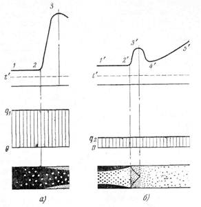 Рис. 10.2. Общая картина температурного режима парообразующей трубы при пузырьковом (а) и дисперсно-кольцевом (б) режимах течения пароводяной смеси.