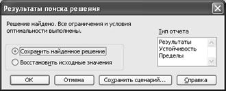 10. Запустите процесс поиска решения нажатием кнопки Выполнить. В открывшемся диалоговом окне «Результаты поиска решения» задайте опцию Сохранить найденное решение (рис. 12.4).