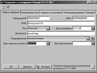 5. Для приема сотрудника на работу используйте приказ о приеме на работу (Документы — Заработная плата — Приказ о приеме на работу). Введите приказы о приеме на работу всех сотрудников с 30.09 в каждую группу (см. рис. 38) с указанием сведений по начислению заработной платы на вкладке Начисление зарплаты (см. рис. 39). Введите данные на сотрудников (счет отнесения затрат по заработной плате — 44.3)