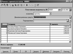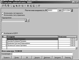 Нажмите кнопку Заполнить, при этом будет заполнена ведомость начисления заработной платы сотрудников всех подразделений (см. рис. 40 и рис. 41).