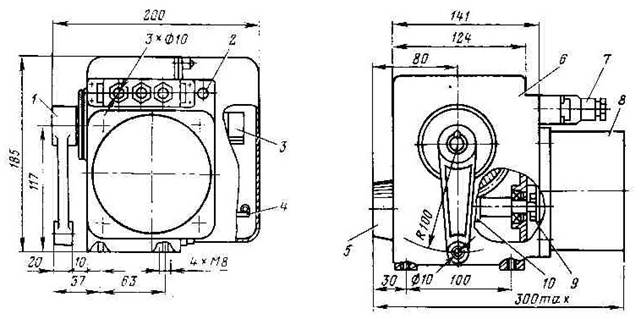 1 – рычаг; 2 – болт заземления; 3 – датчик; 4 – панель; 5 – ручной пивод; 6 – редуктор; 7 – штепсельный разъём; 8 – электродвигатель; 9 – зубчатая пара; 10 – червячная пара