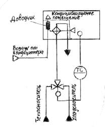 Эжекционные доводчики устанавливают после калорифера второго подогрева (общая часть системы кондиционирования на схеме не показана). Воздух после кондиционера подаётся через сопло доводчика и смешивается в нём с эжектируемым из помещения воздухом, который предварительно обрабатывается в калорифере таким образом, чтобы в помещений поддерживалась определённая температура. Это обеспечивается регулятором температуры прямого действия; регулирующее воздействие при этом осуществляется изменением соотношения расходов тепло- и хладоносителей. подводимых к трёхходовому клапану регулятора.