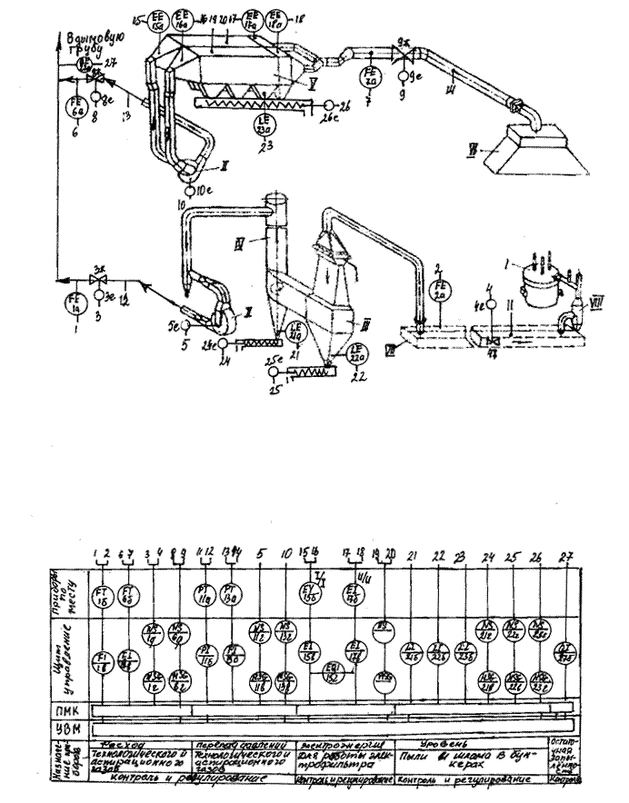 Рис.6.22.Функциональная схема системы автоматического управления газопылеочистной установки на слоевом фильтре: I- электропечь; II- фильтр слоевой; III, XII- винтовой конвейер; IV- дымосос; V- элеватор; VI- бункер приёмный; VII- течка; VIII- тележка; IX- бадья; X- бункер промежуточный; XI- грохот; XIII- привод; XIV- камера дожигания СО; XV- камера закаливания
