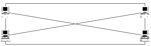Также очевидно, что идеальной с точки зрения безопасности будет взаимодействие объектов распределенной ВС по выделенным каналам. Существуют два возможных способа организации топологии распределенной ВС с выделенными каналами. В первом случае каждый объект связывается физическими линиями связи со всеми объектами системы (рис. 7.2). Во втором случае в системе может использоваться сетевой концентратор, через который осуществляется связь между объектами (топология "звезда" - рис. 7.3).