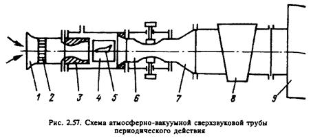В резервуаре 9 создается необходимое для работы разрежение. После открытия быстродействующей задвижки 8 атмосферный воздух устремляется в трубу через форкамеру /, в которой установлены сетки и решетки 2, спрямляющие поток. В сопле 3 воздух, достигнув сверхзвуковой скорости с заданным числом Маха, поступает в рабочую часть 4, где установлен испытуемый объект 5, а затем через диффузор 6 и 7 — в вакуумный резервуар 9. При этом в течение короткого времени в рабочей части создается сверхзвуковой поток. Чтобы предотвратить конденсацию водяного пара в рабочей части, атмосферный воздух пропускают через осушитель.