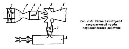 В з ж е к т о р и о й трубе (рис. 2.58) поток воздуха создается от эжектора (струйного насоса) 5, установленного за рабочей частью 5, к которому подается воздух повышенного давления. В ресивере 8 эжектора 5 создается повышенное давление. После открытия крана 7 воздух из ресивера 8 поступает в эжектор 5.