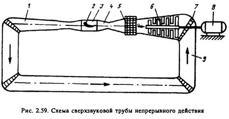 Труба приводится в действие электродвигателем 8, на валу которого находится многоступенчатый компрессор 6, обеспечивающий высокий перепад давлений для работы трубы на сверхзвуковых скоростях. Воздух, пройдя компрессор, сильно нагревается. Поэтому в конструкции трубы предусмотрен охладитель 5, в который и направляется воздух. Охлажденный воздух, пройдя сопло Лаваля 4, приобретает сверхзвуковую скорость и поступает в рабочую часть 3, где установлен объект 2, а затем через диффузор 1 и колено обратного канала 9 с поворотными лопатками 7 возвращается в компрессор.