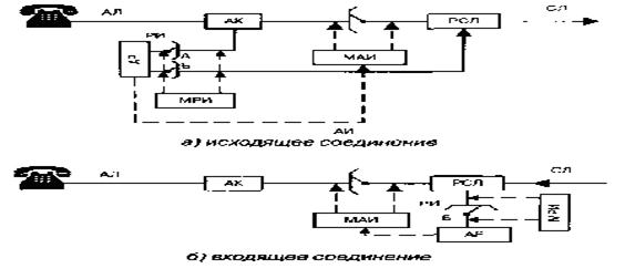 Исходящее соединение (рис. 28 а). После набора абонентом одной, двух или трех цифр, определяющих направление связи с вышестоящей станцией (УС, ЦС) или направление поперечной связи с другой ОС, абонентский регистр занимает маркер блока АИ и передает к нему сигнал о требуемом направлении. Если это – направление к УС или ЦС, МАИ с помощью пробного устройства ПУ РСЛ находит свободный комплект РСЛ и соединяет его с вызывающей абонентской линией через блок АИ. Однако разговорные провода коммутируются в схеме РСЛ лишь после окончания работы АР.