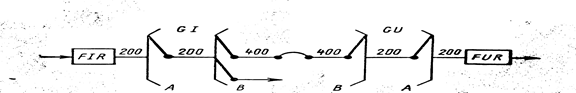 Функциональная схема ступени междугородных соединений МС и линейного оборудования стации АRМ-20 показана на рис.30. Она состоит из входящих (GI) и исходящих (GU) блоков 200 X 200X 400, к ним подсоединяются входящие (FIR) и исходящие (FUR) Комплекты. Соединения на станции устанавливаются, как правило, через четыре звена.