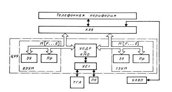 Центральное управляющее устройство. В составе ЦУУ (рис. 36) имеются две электронные управляющие машины ОЭУМ и /ЭУМ, связанные с каналами ввода-вывода. Остановка ЦУУ АТСКЭ приводит к прекращению обслуживания всех вызовов. Поэтому обе ЭУМ постоянно работают, синхронно выполняя одинаковые программы, так что при возникновении неисправности в одной из них вторая продолжает обработку вызовов. Синхронизацию и контроль за функционированием двухмашинного комплекса осуществляет устройство организации двухмашинной работы УОДР.
