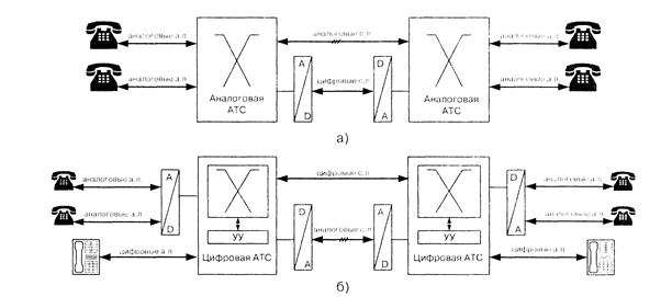Эволюцию от аналоговой коммутации к цифровой иллюстрирует рис. 39. На рис. 39 а показаны аналоговые АТС с аналоговыми абонентскими и соединительными линиями (кстати, такое разделение на абонентскую и сетевую стороны узла коммутации прослеживается по всей книге). На рис. 39 б показана следующая фаза эволюции коммутации. В этой фазе цифровые коммутаторы взаимодействуют с другими цифровыми коммутаторами через цифровые соединительные линии, хотя могут также использоваться аналоговые абонентские линии и аналоговые соединительные линии, но непременно с использованием аналого-цифровых и цифро-аналоговых преобразователей. Однако коммутационное поле является цифровым, что подразумевает коммутацию в станции исключительно цифровых сигналов.