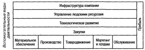 3. Конкурентоспособность цен и издержек предприятия. Должно быть известно соотношение цен и затрат предприятия с ценами и затратами конкурентов. В этом случае используется стратегический анализ издержек с помощью метода «цепочка ценностей», который отражает процесс создания стоимости товара и включает различные виды деятельности и прибыль (см. рис. 10.1)[99].