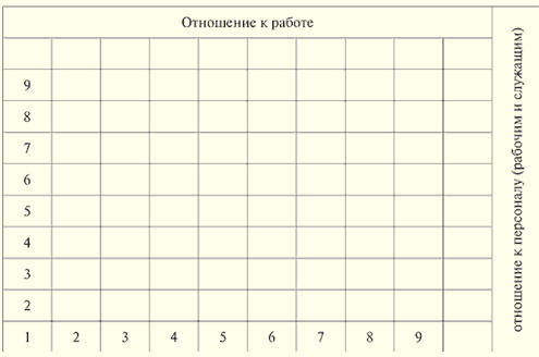 Для определения типа менеджера американские психологи Р. Блэйк и Д. Моутон составили матрицу типов руководителей (используя матрицу, на первое место в скобках ставят отношение к работе, на второе - отношение к людям):