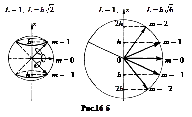 Это радиус сферы, в которой вписаны три конуса с вершинами в центре сферы. При m = 0 конус вырождается в диск, Lz = 0. При m=+1 получаем конус в верхней части, его высота Lz равна +ћ. При m = – 1 получаем конус в нижней части, его высота Lz = –ћ. То, что известна одна проекция на ось, можно толковать с точки зрения классической физики так, что вектор L прецессирует вокруг оси ОZ по образующей конуса (рис16-а).