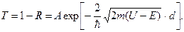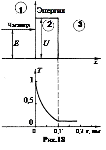 Так как Т ≠ 0, то R ≠ 1. Не всегда микрочастица отражается от стенки. Существует отличная от нуля вероятность, что частица пройдёт сквозь стенку. Плотность вероятности | y |2 уменьшается с толщиной стенки d очень быстро. На рис.18 внизу показана зависимость коэффициента пропускания Т для электрона от толщины стенки d при высоте потенциального барьера U – E = 5 эВ. При d = 0,1 нм Т = 10%, при d = 0,2 нм Т ≈ 1%. При d >0,5 нм величина Т становится исчезающе малой.