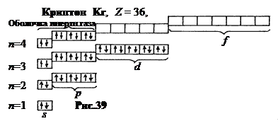 6. Четвертый период, n = 4. Расщепление энергетических уровней в многоэлектронных атомах с ростом номера слоя n оказывается столь значительным, что подуровни разных слоев начинают перекрываться. В результате нижний s – подуровень 4-го слоя оказывается ниже верхнего d – подуровня 3-го слоя (рис.37). Поэтому 19-му и 20-му электронам энергетически «выгоднее» разместиться не на 3 d, а на 4 s – подуровне. Получаются элементы калий К (Z = 19) и кальций Са (Z = 20) – типичные металлы с низкими потенциалами ионизации 4,32 и 6,09 В.