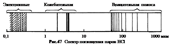 Расщепление линий кроме колебательного обусловлено еще и вращательным движением молекул. В результате спектры испускания молекул содержат группы с большим числом линий – полосы и потому называются полосатыми (рис.47).