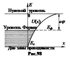 На рис.98 показана зависимость потенциальной энергии электрона от расстояния х до атомной плоскости – стенки металла. Энергетическое расстояние еj от уровня Ферми до нулевого уровня называют термодинамической работой выхода электрона, величину j – потенциалом выхода. Уровень Ес обозначает дно зоны проводимости, где Е = 0. У металлов работа выхода еj заключена в пределах 1,8 ¸ 5,3 эВ. Меньше всего она у щелочных металлов, больше – у золота, серебра, платины (табл. 14.1).