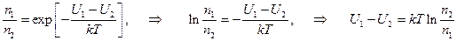 Здесь n 01 и n 02 – концентрация электронов проводимости на уровнях Ферми. В силу полной заполняемости этих уровней будем полагать n 01 = n 02; U 1 и U 2 – потенциальная энергия электронов в металлах 1 и 2. Она может изменяться от нуля на уровне Ферми до еj (работа выхода) на нулевом уровне. Разделим первое уравнение на второе.