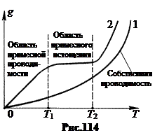 На рис.114 сравнивается удельная электропроводность у чистого полупроводника (кривая 1) с электропроводностью примесного полупроводника n –типа (кривая 2) при разных температурах. Вначале примесная проводимость существенно преобладает над собственной и растет почти линейно с температурой. При некоторой температуре Т 1 происходит полная ионизация доноров, и рост примесной проводимости прекращается. При некоторой температуре Т 2 > Т 1 начинается интенсивная ионизация собственно полупроводника. Независимо от типа полупроводника электропроводность быстро увеличивается и при Т > Т 1 может быть представлена формулой: