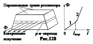 При переходе к режиму генерации почти все излучения концентрируются в плоскости p-n – перехода, распространяясь перпендикулярно оптическим окнам кристалла. Отношение вероятности излучательной рекомбинации к вероятности безизлучательной увеличивается. В результате при I > I пор происходит резкий рост светового потока Ф (рис.128 справа).