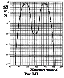 В статистике распределение масс осколков для U-235 показано на рис.141. По вертикальной оси отложены числа случаев в процентах, а по горизонтальной – масса одного осколка. Левый горб соответствует 7 % случаев с массой одного осколка 96 нуклонов. Масса другого осколка получается» 235 – 96 = 136 + 3. Это примерно молибден и барий. Правый горб (тоже 7 % случаев) соответствует такому же соотношению масс осколков. Одинаковые осколки массой примерно по 116 нуклонов (примерно индий) получаются лишь в 0,01% случаев (впадина на графике).