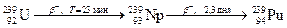 U делятся только быстрыми нейтронами с энергией E ³ 1 МэВ. При меньших энергиях нейтронов ядро урана-238 испытывает радиационный захват. Оно поглощает нейтрон, превращаясь в b – – активный изотоп уран-239 с периодом полураспада 23 мин.