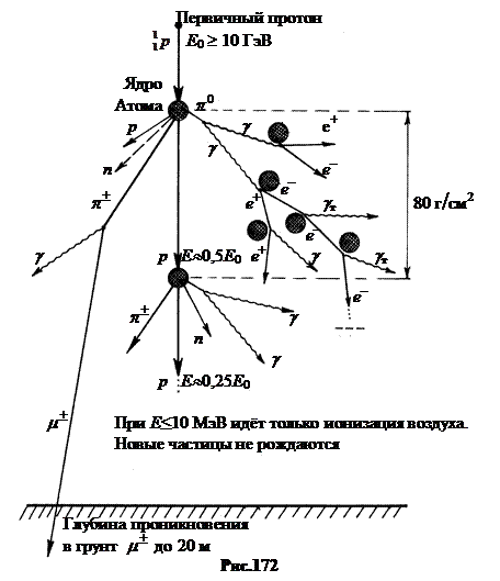 а. Ядерно-активная компонента содержит протоны и нейтроны, возникающие при взаимодействии протонов и других частиц ПКЛ высокой энергии Е 0 > 1 ГэВ с ядрами атомов земной атмосферы, в основном, азота N и кислорода О. При ударе частицы о ядро примерно половина ее энергии тратиться на выбивание из ядра нескольких нуклонов с энергиями Е» 0,2 ГэВ, на возбуждение конечного ядра и на множественное рождение релятивиских частиц. В основном – это пионы p +, p 0, p –. Их число в расчете на первичный протон с энергией Е 0 = 100 ГэВ может доходить до 10 (рис.172).