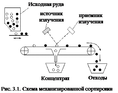Сортировка минералов может осуществляться по их цвету и блеску. Например, куски слюды (мусковит), свинцового блеска, золотоносного кварца хорошо видны среди массы пустой породы. Следовательно, их выборку можно осуществить, применяя фотометрический метод (рис. 3.1).