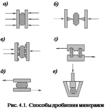 Раздавливание, раскалывание, излом – проводят в щековых и конусных дробилках; удар, истирание – в роторных; раскалывание, раздавливание – в стержневых дробилках-дезинтеграторах.