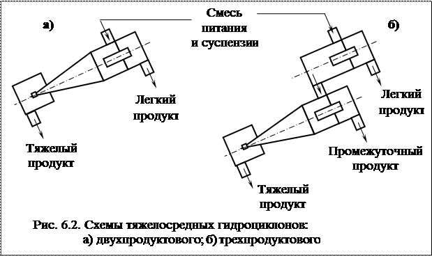 Трехпродуктовый тяжелосредный гидроциклон (рис. 6.2, б) позволяет в едином потоке суспензии разделить материал на три продукта.