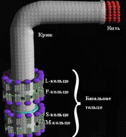 Жгутик состоит из трех частей: нити, крюка и базального тельца (рис. 2). С помощью базального тельца, в которое входит центральный стержень и кольца, жгутик закреплен в цитоплазматической мембране и клеточной стенке. Количество колец у грамотрицательных и грамположительных бактерий различно. У грамотрицательных бактерий имеются четыре кольца: L, P, S, M. Из них L и P – наружная пара колец; S и M внутренняя пара колец. L-кольцо закреплено в наружной мембране, P – в пептидогликановом слое клеточной стенки, S – в периплазматическом пространстве, а M – в цитоплазматической мембране. У грамположительных бактерий базальное тельце устроено проще. Оно состоит только из двух колец: S и M, т. е. только из внутренней пары колец, которые размещаются в цитоплазматической мембране и клеточной стенке.