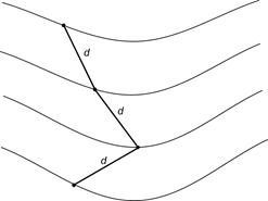 Чтобы уклон линии не превосходил i пр, ни одно заложение на ней не должно быть меньше, чем рассчитанное d. Если расстояние между горизонталями больше рассчитанного, направление линии можно выбирать произвольно. В противном случае в раствор циркуля берут отрезок, равный d, и строят ломаную линию, умещая между горизонталями рассчитанное предельное заложение (рис. 4.9).