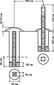 см и скрепленный с ним цементным раствором якорь диаметром 50 см и высотой 20 см. Основание центра располагают на 50 см ниже границы наибольшего промерзания грунта, но во всех случаях не менее 1,5 м от поверхности земли. На верху пилона крепится (цементным раствором или приваривается) чугунная марка, на верхней поверхности которой отмечена точка, к которой относятся координаты пункта.