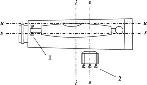 | Рис. 9.5. Оси и исправительные винты нивелира: ss – визирная ось зрительной трубы; ii – ось вращения прибора; uu – ось цилиндрического уровня; ee – ось круглого уровня; 1 – исправительные винты цилиндрического уровня; 2– исправительные винты круглого уровня |