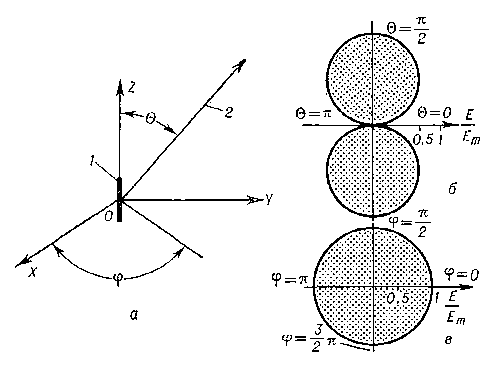 Рис. 1. Элементарный электрический вибратор: а — схема: 1 — вибратор; 2 — направление в точку наблюдения; б — диаграмма направленности в плоскости YOZ; в — диаграмма направленности в плоскости XOY.