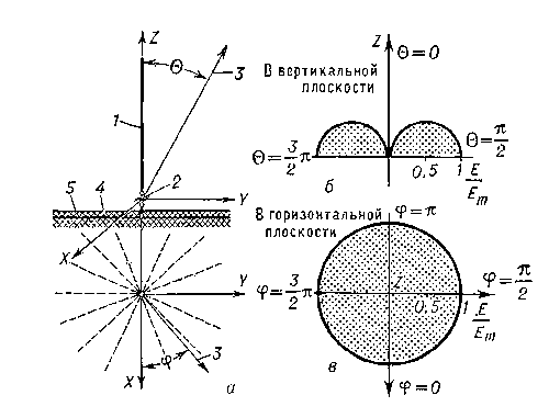 Рис. 2. Вертикальный несимметричный вибратор: а — схема: 1 — провод (излучатель); 2 — клеммы, присоединяемые к передатчику; 3 — направление в точку наблюдения; 4 — система заземления; 5 — поверхность земли; б — диаграмма направленности в вертикальной плоскости; в — диаграмма направленности в горизонтальной плоскости.