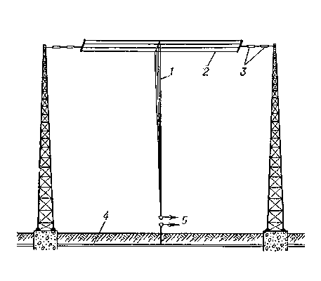 Рис. 3. Т-образная антенна длинных волн: 1 — снижение (излучатель); 2 — горизонтальная часть; 3 — изоляторы; 4 — система заземления; 5 — клеммы, присоединяемые к передатчику.