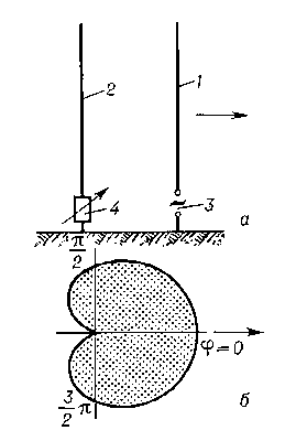 Рис. 4. Сложная антенна средних и длинных волн: а — схема: 1 — активный вибратор, выполняемый в виде антенны-мачты либо аитенны-башни; 2 — пассивный вибратор, выполняемый в виде антенны-мачты либо антенны-башни; 3 — клеммы, присоединяемые к передатчику; 4 — элемент настройки; б — диаграмма направленности в горизонтальной плоскости. Стрелкой показано направление максимального излучения.