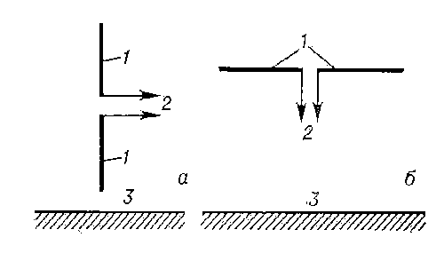 Рис. 6. Симметричные вибраторы: а — вертикальный; б — горизонтальный: 1 — вибратор; 2 — симметричная линия питания; 3 — поверхность земли.