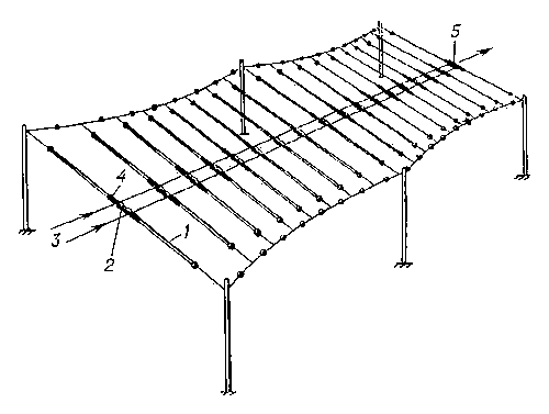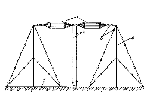 Рис. 7. Диполь Надененко: 1 — диполь; 2 — симметричная линия питания; 3 — изоляторы; 4 — мачта с секционированными оттяжками; 5 — поверхность земли.