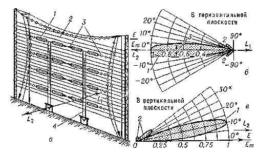 На дальних коротковолновых линиях связи необходимы А. с большими КНД, чем КНД симметричного вибратора. В качестве таких А. часто применяют синфазную А. (рис. 8, а), представляющую собой плоскую решётку из симметричных вибраторов, возбуждённых токами одинаковой фазы. В направлении, перпендикулярном к центру решётки, на большом расстоянии от синфазной А. поля, создаваемые излучением всех вибраторов, синфазны, т. к. пути волн от вибраторов до точки приёма практически одинаковы. В этом направлении создаётся максимальная напряжённость поля. В других направлениях пути и соответственно фазы волн различны, и интерференция волн, излучаемых отдельными вибраторами, приводит к ослаблению суммарной напряжённости поля. Чем больше вибраторов в одном горизонтальном ряду, тем уже диаграмма направленности в горизонтальной плоскости. Диаграмма направленности в вертикальной плоскости сужается с увеличением числа горизонтальных рядов (этажей) вибраторов. Для получения однонаправленного излучения и увеличения КНД в 2 раза решётки дополняются пассивным рефлектором в виде идентичной решётки, в которой, вследствие пространственной электромагнитной связи, возбуждаются токи такой амплитуды и фазы, что излучение в направлении L 1 резко ослабляется (рис. 8, а), а в направлении L 2 усиливается. Для того чтобы синфазная А. могла работать в широком диапазоне волн (до 2-кратного и более) без специальных устройств, согласующих её входное сопротивление с волновым сопротивлением питающего фидера, вибраторы часто выполняются в виде диполей Надененко. Для устранения необходимости перестройки рефлектора при смене λ его иногда выполняют в виде густой сетки из горизонтальных проводов (апериодический рефлектор), малопроницаемых для волн, излучаемых А. Диаграмма направленности коротковолновой синфазной А. в горизонтальной (рис. 8, б) и вертикальной плоскостях (рис. 8, в) состоит из одного большого (главного) лепестка и множества малых (боковых) лепестков. Чем ниже уровень боковых лепестков, тем выше качество А. При передаче боковые лепестки приводят к бесполезному рассеиванию части мощности, при приёме — увеличивают вероятность попадания в тракт приёмника мешающих сигналов, идущих с разных направлений. КНД D синфазной А. приближённо определяется по формуле